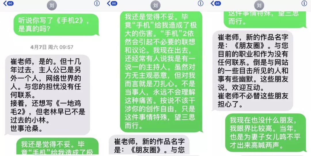 ▲崔永元在微博中晒出与刘震云沟通的短信