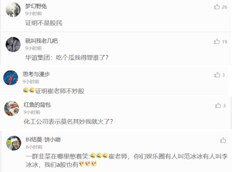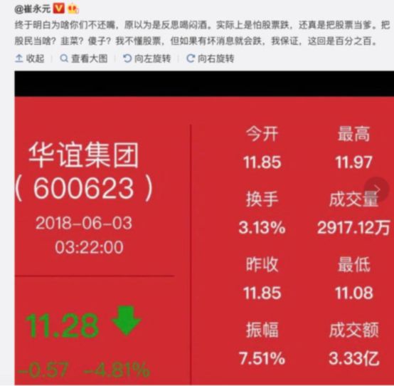 综合梳理事件经过后,每日经济新闻(微信号:nbdnews)记者注意到,崔永元的愤怒更多地集中在冯小刚、刘震云以及背后的投资方华谊兄弟身上。但在一条微博中,崔永元犯下了一个低级错误,将上市公司华谊集团的下跌当做自己的功劳了,而这个搞化工的华谊集团,跟拍电影的华谊娱乐,真的是八竿子都打不着......