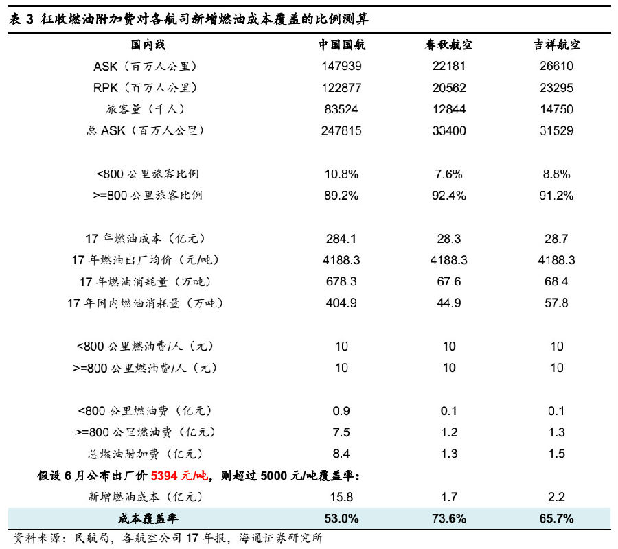 海通证券进行了测算并在研报中表示,6月公布的航空煤油出厂价5394元/吨,则800公里以下收取燃油附加费10元,800公里以上收取燃油附加费10元。则按照5394元/吨燃油成本计算,中国国航、春秋航空、吉祥航空分别能覆盖5000元/吨以上的新增燃油成本的53%、73.6%、65.7%。