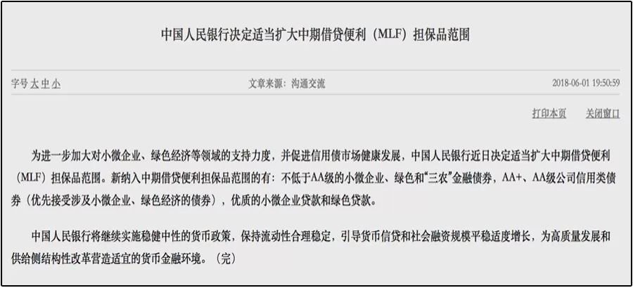 央行出面提供隐形信用担保咯。既然央妈都接受AA+、AA级公司信用类债券、优质小微企业贷款作为借钱的担保品范围了,就相当于做了个隐形信用支持。意思就是说市场要放心,虽然这类债券在申请MLF时会打折,但毕竟是被接受了。