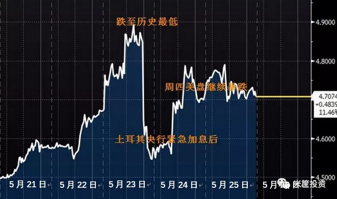 紧接着土耳其里拉跟随“暴雷”!同样是周三,土耳其里拉跌至历史最低点——1美元兑4. 9282里拉。土耳其央行紧急加息300基点后,里拉一度收复多达5.2%的跌幅,但到周四美股盘前继续暴跌近4%。