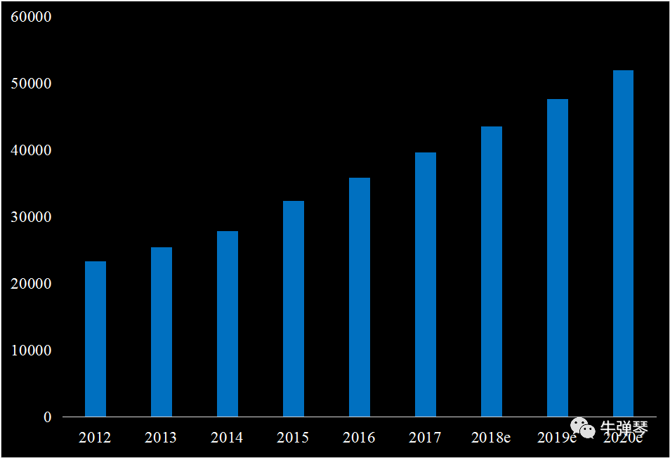 中国餐饮市场规模(万元),数据来源:《2018-2020年中国餐饮连锁业投资分析及前景预测报告》