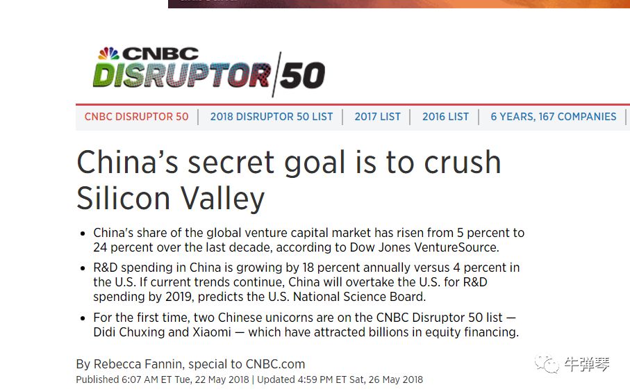 知名财经媒体CNBC就注意到,过去10来年,中国风险资本占全球市场的份额从5%,猛增到24%,中国研发投入将在2019年超过美国,大量颠覆性创新公司出现在中国。