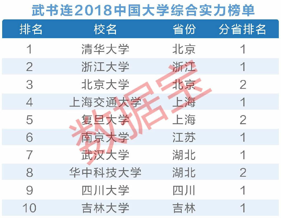 根据武书连2018中国大学综合实力排行榜,中国大学综合实力前十名未发生变动,清华大学依然稳居中国大学榜单第一名。但2017年排名第二位的北京大学被浙江大学反超,最新排名中国大学榜单第三名。2017年排名第9名的华中科技大学超过四川大学,上升至第八名,紧随武汉大学之后。