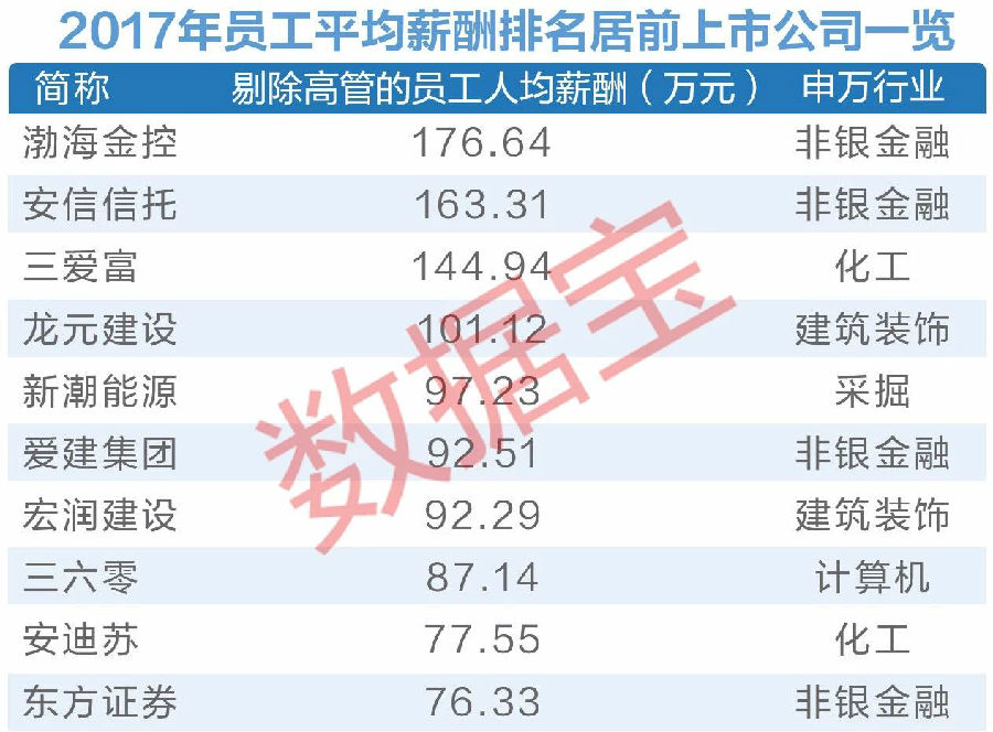 一直以来,上市公司薪资待遇普遍优于全国平均水平。今年5月份,国家统计局公布2017年城镇单位就业人员年平均工资数据,其中非私营单位年平均工资为7.43万元,私营单位年平均工资为4.58万元。据统计,2017年A股上市公司员工年平均薪酬为13.6万元,大幅超出全国水平。剔除公司高管后,上市公司员工年平均薪酬也在13万元以上,为13.38万元。
