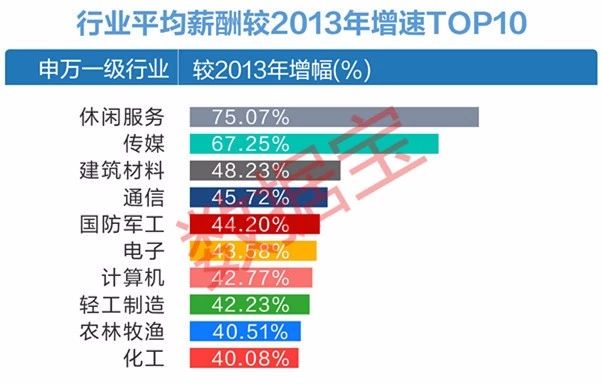 值得一提的是,休闲服务、传媒、建筑材料等行业薪酬增长较为显著,员工年平均薪酬较四年前增幅均在40%以上。综合、交通运输、非银金融、银行、建筑装饰等行业薪酬增速排名垫底,其中综合、交通运输行业员工平均薪酬不升反降,与四年前相比,降幅分别达到54.12%、1.96%。被大众誉为“金饭碗”的非银金融、银行业员工薪酬增速分别为1.20%、10.58%。此前,多家券商被传出裁员降薪消息。