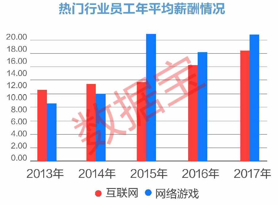 与其他传统行业相比,新兴行业上市公司薪酬水平优势明显。以网络游戏、互联网为例,2017年这两个行业相关上市公司员工平均薪酬分别为18.84万元、16.47万元,超出大部分行业薪酬水平。其中网络游戏上市公司薪酬增幅显著,与四年前相比,该行业员工平均薪酬增幅达到118%。