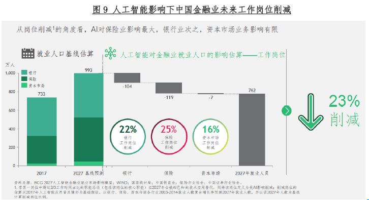 报告根据模型测算,到2027年,中国金融业就业人口可达993万人(2017年就业人口基础为733万人),其中,将有230万金融业岗位因人工智能的应用而被削减,即金融业就业人口的23%。而余下77%的从业者主要为需要解决复杂问题、应对人际情感交互及随机多变环境的岗位,将不会受到人工智能的颠覆,反而会在人工智能的协助下提升效率。