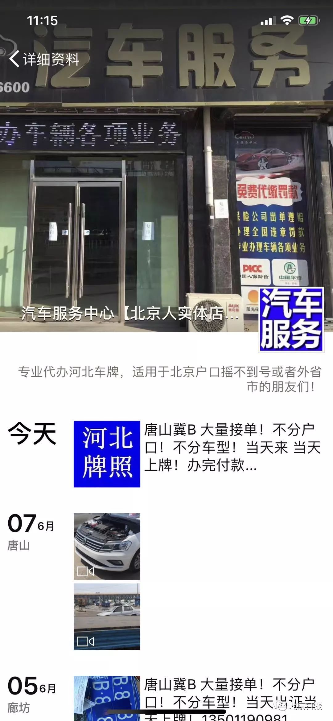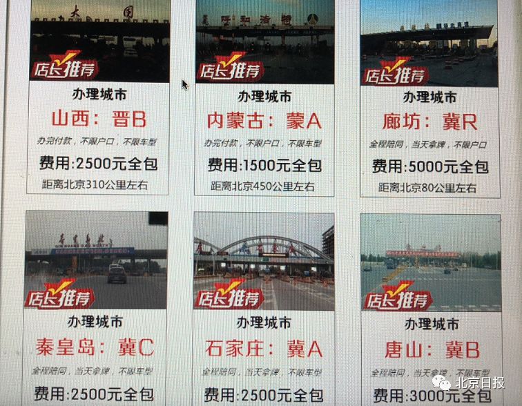 一位操着京腔的工作人员向记者介绍:“北京户口可以上唐山牌,5500元全包。可以随时来办,什么都不用准备,当天就能拿牌。”该店微信平台近日也在主推唐山牌:“唐山冀B大量接单!不分户口!不分车型!当天来当天上牌!办完付款。”