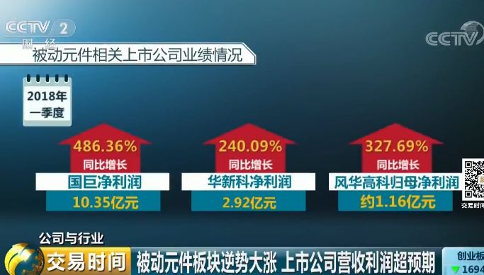 国巨2018年一季度净利润10.35亿元,同比增长486.36%;