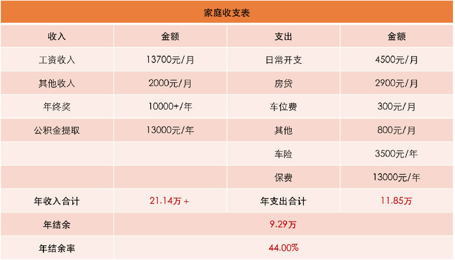 由于男主的年终奖金额不固定,所以目前的家庭收入中并未将这笔奖金录入进去,但即使没有男主的年终奖,H先生一家目前的年结余也可以保持在44%左右,这一比例还是不错的。