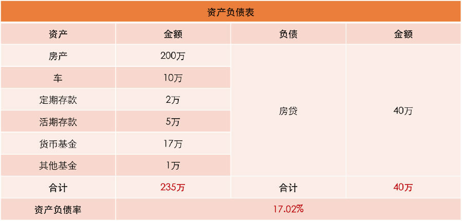目前H先生一家的总资产共计235万元,房贷剩余40万元,负债率为17%,远低于50%的警示红线,不会构成财务风险。每月要支付的2900元房贷,占家庭月总收入的18%,也低于40%的红线,财务压力较小。