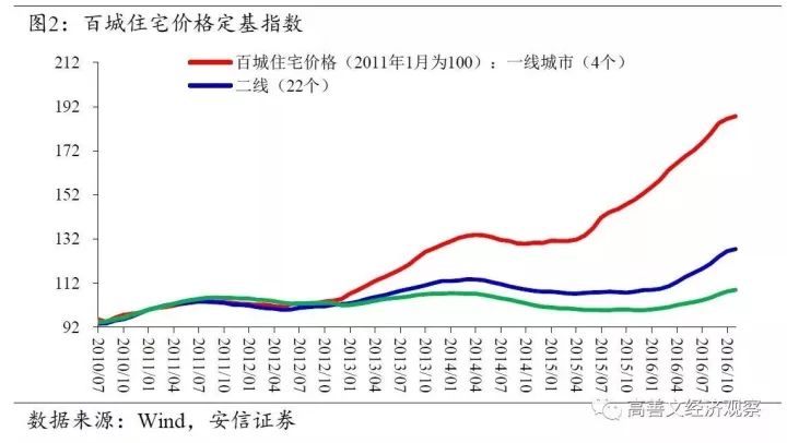 由于前面讨论的人口流向的分化,不同城市的存货去化速度呈现显著差异,导致2016年初以来,不同城市之间的房价呈现排浪式上升:率先完成存货去化的城市房价领涨,后续其他城市存货去化逐步完成,房价开始跟随上涨。