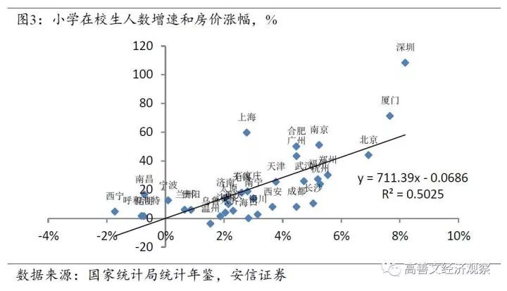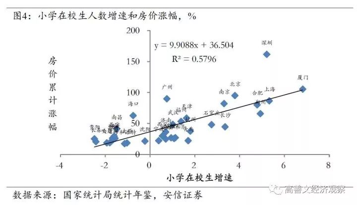 图4中我们进一步扩展了数据的时间序列长度,横轴是2009年到2015年小学在校生的增速,纵轴是这些城市2009年1月到2016年9月(新的一轮房地产调控政策出台之前)房价的涨幅。可以看到,两者之间的关系在更长的时间跨度上进一步增强,拟合优度进一步提高到58%的水平。