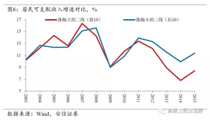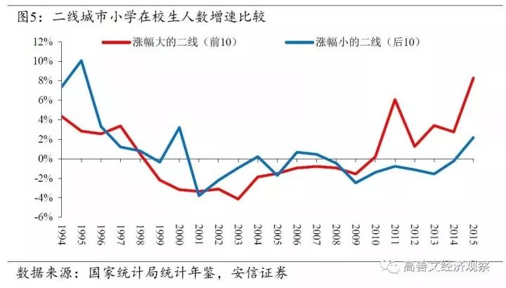 这意味着,2010年以前,从小学在校生人数增速的角度观察,房价涨幅靠前的二线城市和靠后的二线城市人口流入的趋势没有明显的区别。人口开始流入一部分二线城市,而离开另一部分城市,这种情况是2011年到2012年才开始出现的。
