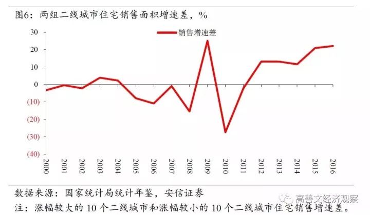 我们比较这两组二线城市住宅销售面积增速的差异(见图6)。可以看到在2010年之前,两组城市的住宅销售面积增速的差平均略低于0,但是2011年以后两组城市住宅销售增速的差维持了较高的水平,后期进一步扩大到20%左右。所以在人口大量流入和流出的二线城市,除了小学生人数增速的差异外,我们也可以在住宅市场上看到明显的差异。