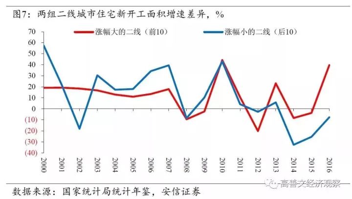 继续对比这两组城市的住宅新开工面积增速的差异(见图7)。2012年之前,两组城市住宅新开工面积增速的差别不大。而在2012年以后,房价涨幅居前的城市住宅新开工面积增速明显高于房价涨幅靠后的城市。