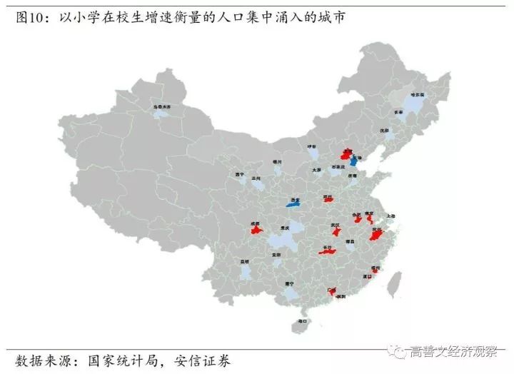那么,在都市化过程中,人口集中流入了哪些城市呢?我们总结在图10显示的中国地图上。红色的区域是小学在校生人数增速大于平均水平加两倍标准差,蓝色的区域是大于平均水平加一倍标准差。