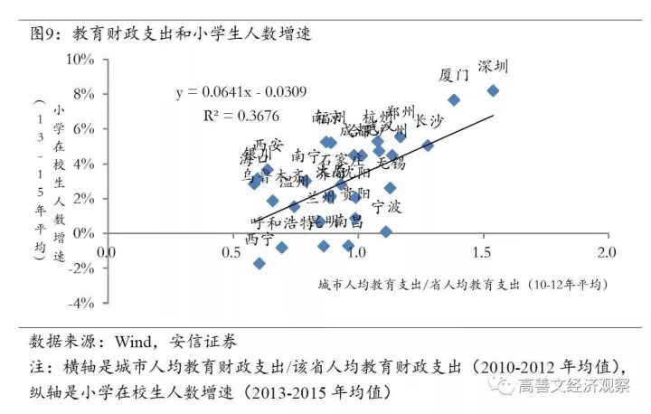 图9中横轴是中国不同城市在公共教育领域的投入情况,纵横是中国不同城市小学在校生人数增速。考虑到中国的人口流动大多集中在省份内部,我们用城市人均教育财政支出与该省人均教育财政支出的比值,来衡量教育资源的集中情况。可以看到这两组变量之间存在非常强的关联。