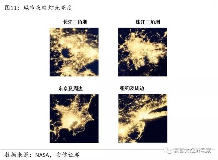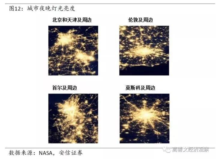首先,我们使用美国国家航空航天局的数据,观察相同的比例尺下在高空拍下来的城市夜晚灯光亮度。图11是四个地区,包括中国的长三角、珠三角、东京周边以及纽约的周边。图12是北京和天津的周边,伦敦的周边,韩国首尔的周边以及莫斯科的周边。