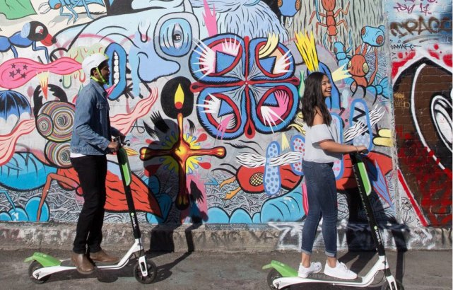 旧金山用户在涂鸦墙前使用Lime滑板车