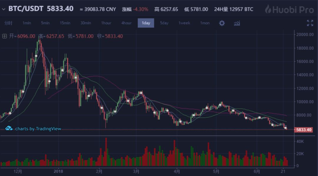据火币网数据,截至今日下午4点,比特币最低跌至5781美元附近,较比特币的历史最高点下跌70%。按照1700万个比特币计算,半年来比特币总市值蒸发超2300亿美元(1.5万亿人民币)。而且,近日比特币出现加速下跌趋势,仅最近三天,比特币就跌了近1000美元。