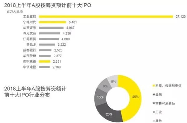 数据显示,2018年上半年,前十大IPO共筹资583亿人民币,同比增加156%。其中,富士康筹资271.2亿人民币,占前十大筹资总额的46%。此外,政策推动首两家“独角兽”企业宁德时代、药明康德加速完成上市,分列前十大IPO的第二位和第九位。