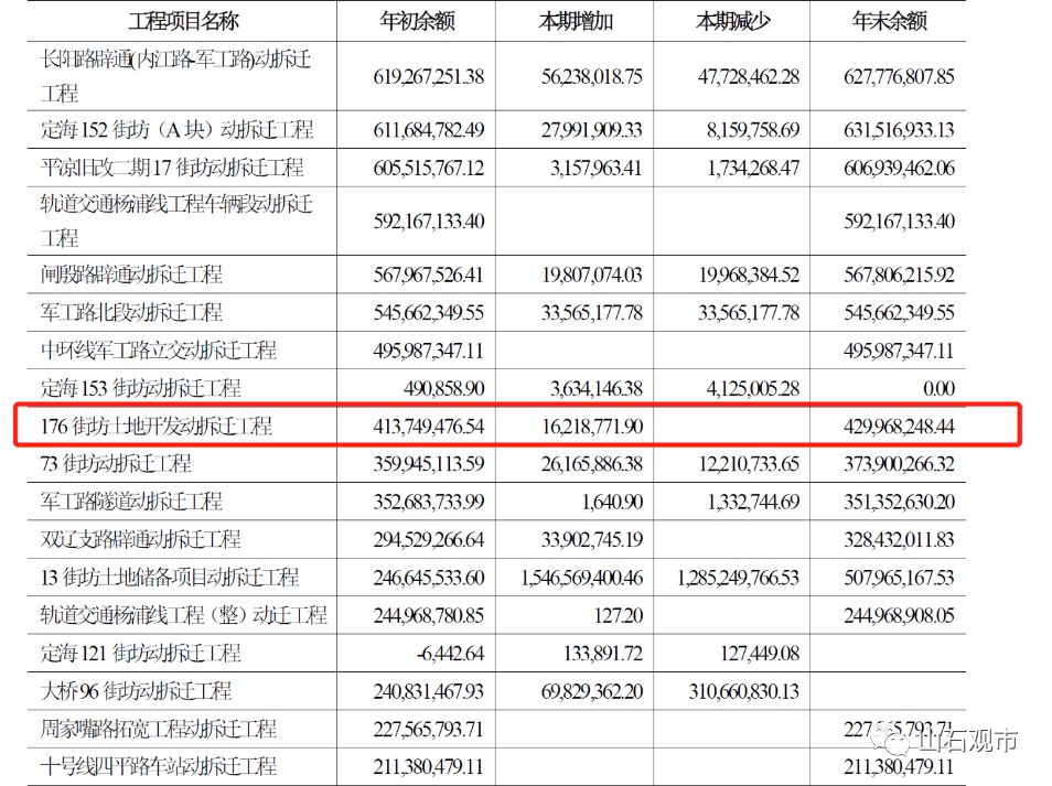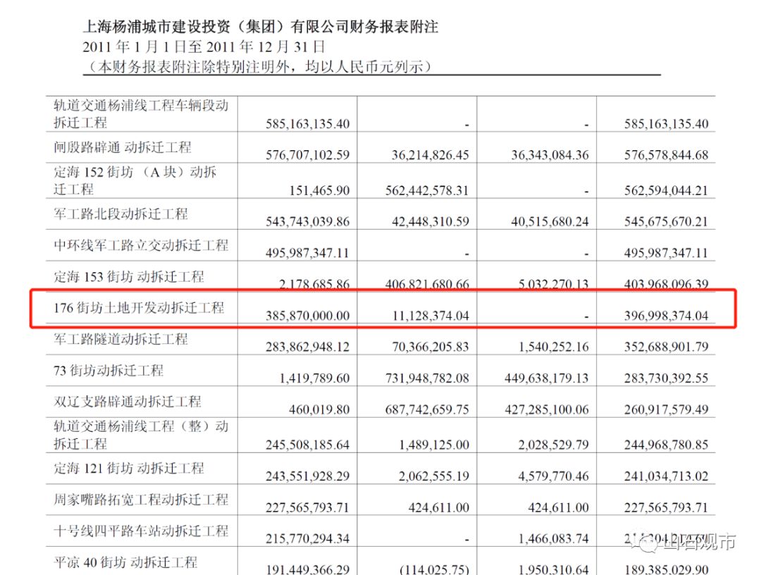 从年报中,我们可以清楚的看到从拍到地的第一天起,杨浦城投就把176这块地的成本以在建工程余额的形式体现在了在建工程一栏。这与其他的拆迁工程似乎是显而易见完全不同的概念。