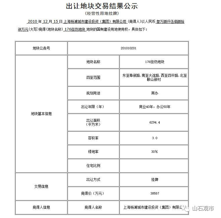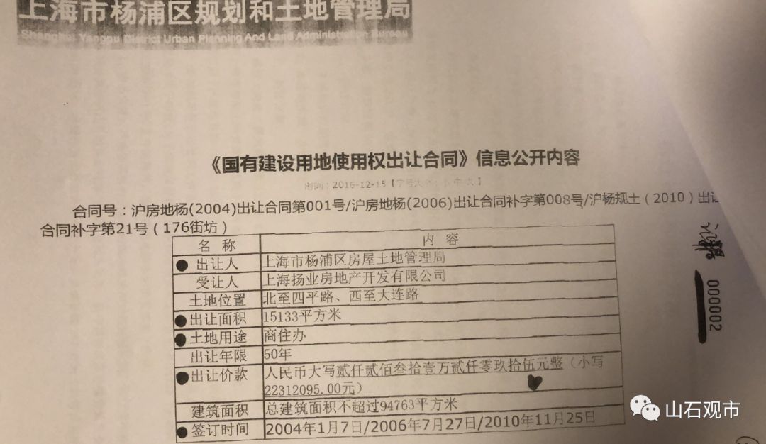 从杨浦区规土局的公开信息可以查询到,上海扬业房地产开发有限公司在2004年从杨浦区房地局受让了176街坊地块,总价2231万,折合每平米均价1474元。
