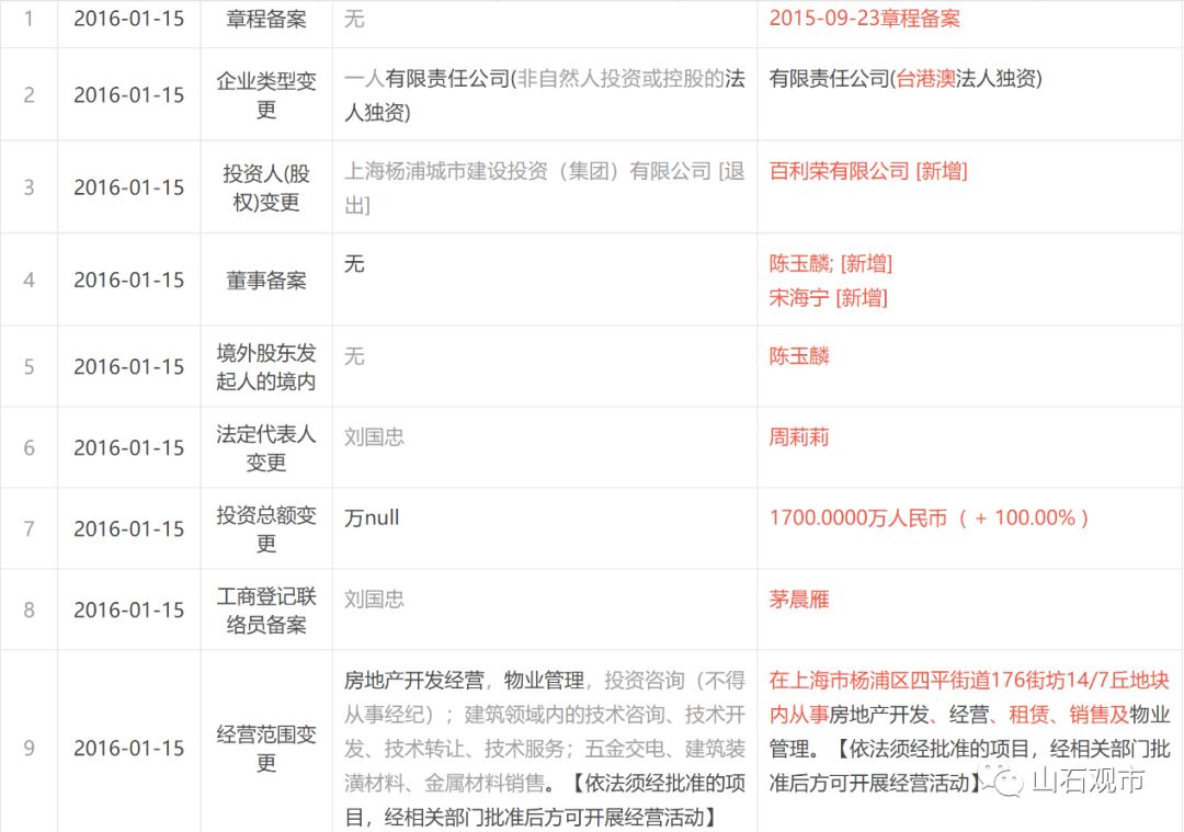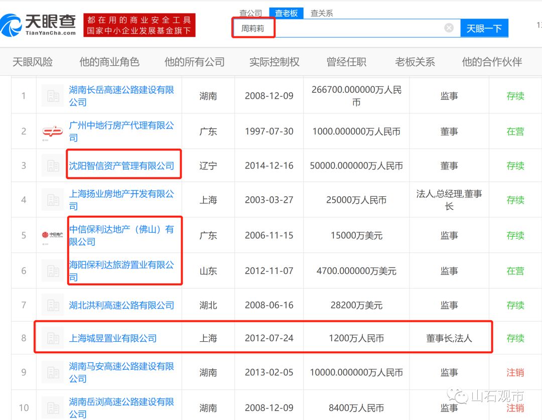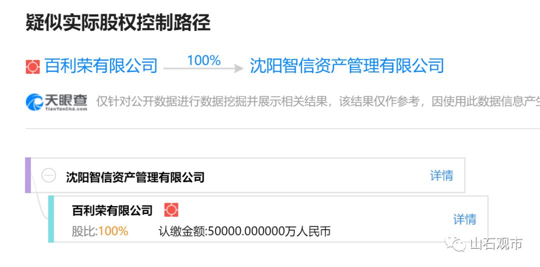 扬业地产的工商信息可以看到,2015年之前,扬业地产是自然人周宝才一人控股的企业,2016年,在城昱置业挂牌转让之后,扬业地产的股权和公司人员结构发生了巨大的变化,公司的唯一控股股东变为了沈阳智信资产管理有限公司,公司的法人和董事长变为了周莉莉。沈阳智信资产管理有限公司的唯一控股股东即之前提到的百利荣有限公司。也就是说扬业地产在2015年之后也通过股权变更,复制了城昱控股的人员结构和股权结构。