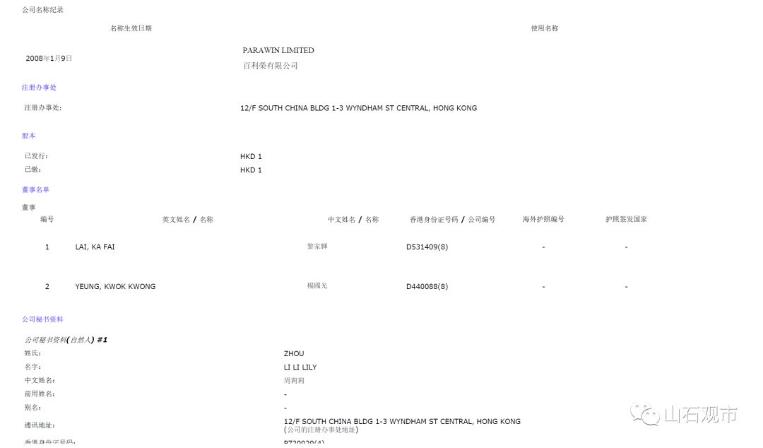 2015年股权变更的受让方,百利荣有限公司是一家注册在香港的公司,查阅工商信息后我们可以看到如下信息。