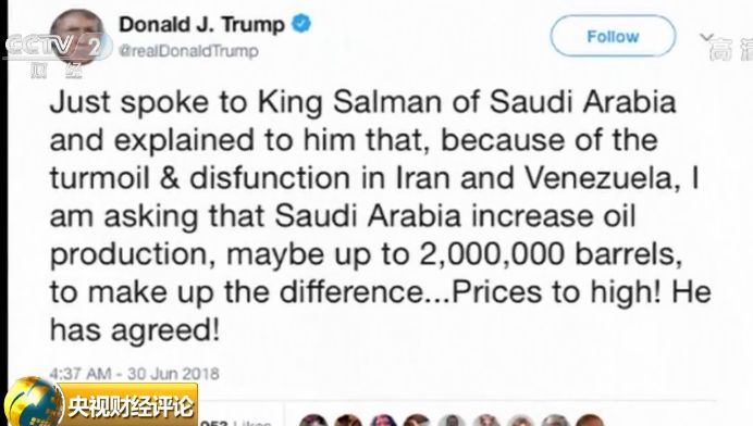 6月30日,特朗普当天在社交媒体推特上发文说,他与沙特国王萨勒曼通话,提出沙特每日增产或多至200万桶原油的要求,以弥补部分产油国产量减少造成的供应缺口。特朗普在推文上称,萨勒曼对此表示同意。据媒体报道,沙特方面表示,特朗普与萨勒曼讨论了需要致力于保持原油市场稳定的问题,但并未提及沙特是否同意特朗普推文中提到的增产数量。