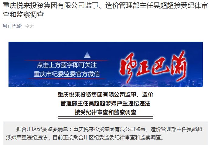 7月5日晚,重庆市纪委监委“风正巴渝”微信公众号发布消息:重庆悦来投资集团有限公司监事、造价管理部主任吴超超涉嫌严重违纪违法,目前正接受合川区纪委监委纪律审查和监察调查。