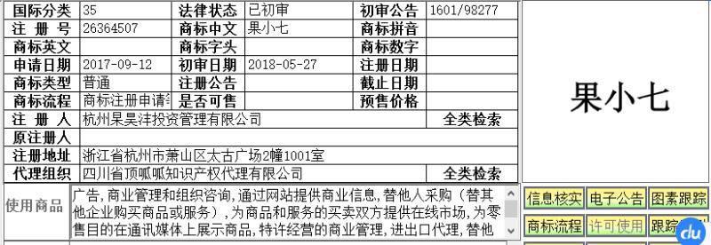 结果显示“果小七”的商标被一家名为杭州杲昊沣投资管理有限公司的企业注册,而初审则在今年5月27日就已经通过,其注册时间仅仅比杨伟东提前十几天。