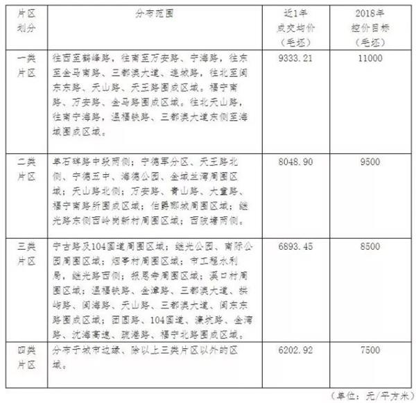 调控总共划分4个片区,其中,一类片区今年调控目标价最高,为11000元/平;四类片区今年调控目标价最低,为7500元/平。