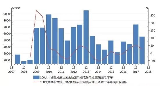 首先,三四线城市新增土地持续高增。2017年下半年和2018年上半年,全国100大中城市中,三线城市土地成交面积1.29亿平米,按一年计算,创下近四年来新高(参见下图)。