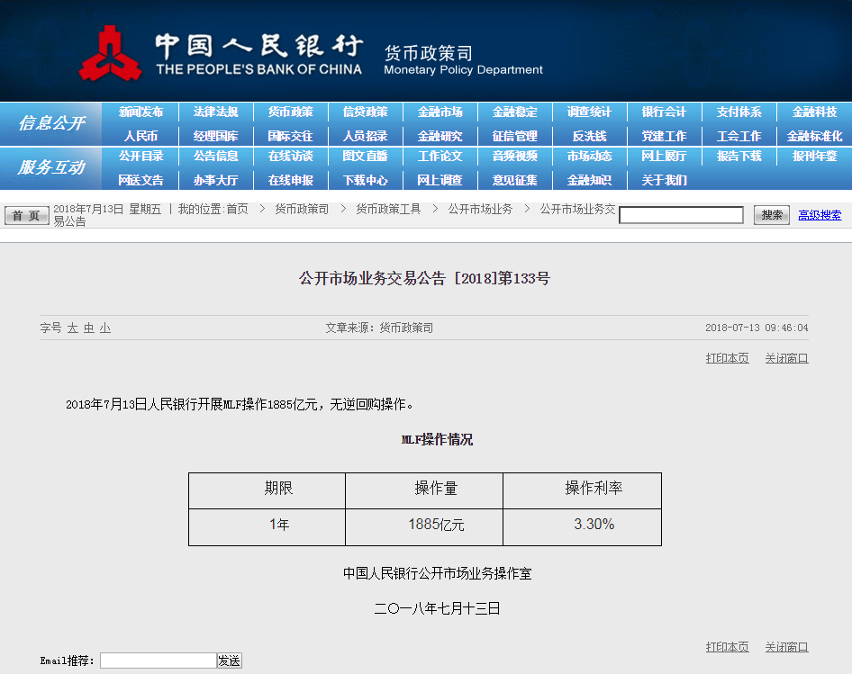 中国央行今日进行1885亿元MLF操作,中标利率3.3%,无逆回购操作。今日有1885亿元MLF和200亿逆回购到期。