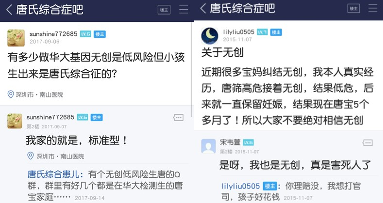 如果不限定华大品牌,那么“无创漏检”的基因缺陷儿童群体,则更不鲜见。如某位妈妈观察发现,自己所在的QQ群中,仅2017年4月一个月,就增加了9个唐氏儿,其中有3个是“无创低危”生下来的,达到了该群唐氏儿新増比例的30%。而在百度“唐氏综合症吧”和“蜜糖宝宝吧”中,类似的控诉也是随处可见——