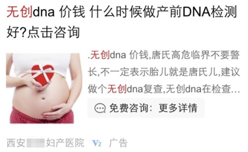 在这家西安妇产医院的百度广告中,关键词是“唐氏高危临界不要紧张,做个无创DNA复查”。
