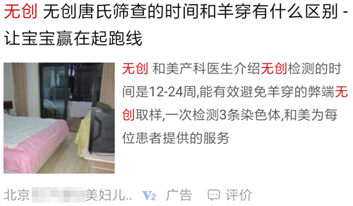这是某妇产医院在百度投放的广告截屏,当搜索“无创”关键字时,便会触发该广告。其中最关键的信息是“有效避免羊穿的弊端无创取样”。