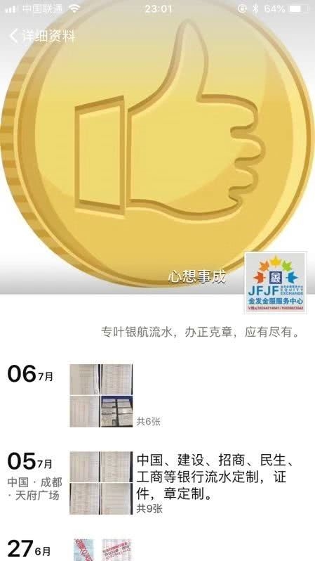 通过一个购买链接,记者添加了名为“心想事成”、号称提供银行流水代办服务的微信号。在这个微信号的朋友圈介绍里,赫然写着,“专叶银航流水,办正克章,应有尽有”。尽管错字连篇,但还是能看出他真正从事的业务。