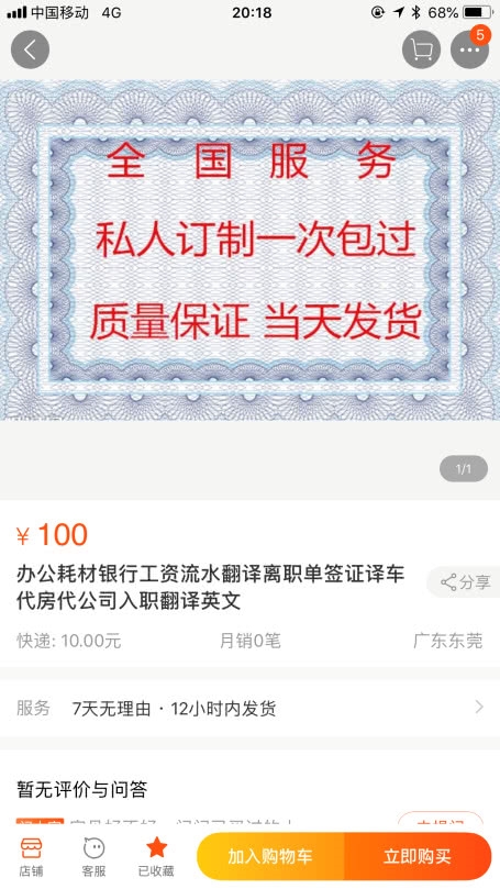 不仅在门户网站,在电商平台上,当记者搜索“银hang流水”时,可以轻易找到相关店铺链接,称“银行流水、房车贷、入职签证”等都可以“私人订制一次包过”、“全国服务”、“质量保证当天发货”。