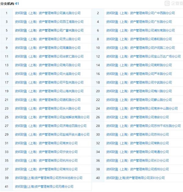 据了解,其有41家分支机构,集中在上海。而据网络资料显示,资邦财富的门店还开到了浙江、江苏等部分城市。