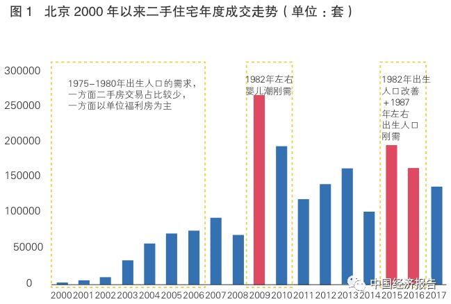 2.人口增长放缓和老龄化促使住房需求放缓。宏观环境和政策的确可以改变房地产市场的运行方向,但只能在中短期内影响主力需求释放的时间,而人口结构及其生命周期则是基础的决定因素之一。以北京为例,结合近15年北京二手住宅走势可以发现,成交较热的年份和第一波婴儿潮面临购房需求的年份吻合、成交走势和进入婚育阶段的人口走势基本一致(图1)。