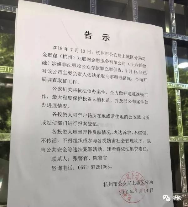 7月14日,上城分局再次发布通告,对十六铺金融背后的金聚鑫公司立案调查,公司主要负责人已被采取刑事强制措施。