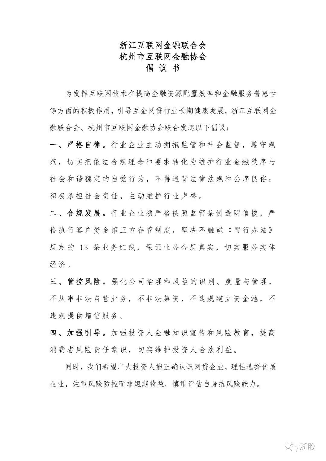 风雨飘摇之下,7月13日,浙江互联网金融联合会、杭州市互联网金融协会发布倡议书: