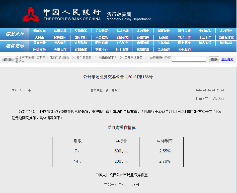中国央行公开市场7天、14天逆回购中标利率分别为2.55%、2.70%,均与此前持平。今日无逆回购到期,共实现净投放800亿元。