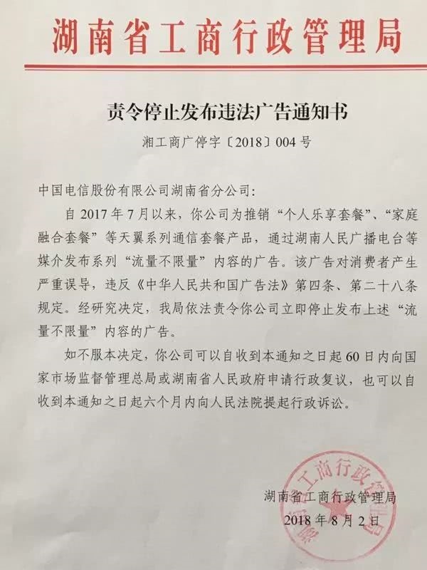 湖南省工商局同时认为,三大运营商通过依靠优势垄断地位大量发布“流量不限量”虚假广告,相互之间追求用户数量,造成消费者投诉举报不断,社会舆情披露反映不断,侵犯了消费者的合法权益,损害了央企的社会公信力,破坏了公平有序的广告市场正常秩序。三大运营商必须立即停止发布“流量不限量”广告,扎实进行整改,严格遵守法律法规,切实维护消费者合法权益。据此,湖南省工商局向三大运营商下发“责令停止发布违法广告通知书”。