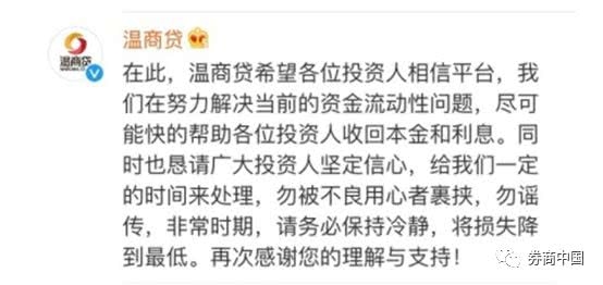 与众多平台宣布停业、逾期等公告类似,温商贷也不约而同的提到,自6月下旬以来,行业环境持续恶化,投资人信心遭受严重挫伤,平台遭遇有史以来最大的流动性危机。