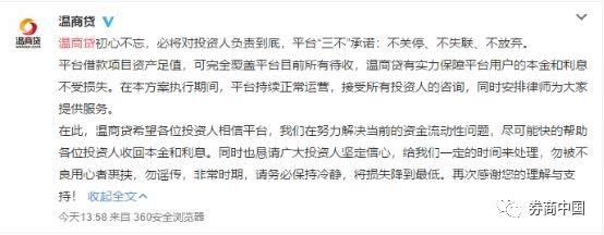 温州贷在公告中,做出了平台“三不”承诺:不关停、不失联、不放弃。
